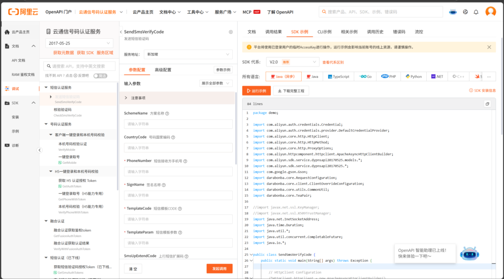 在该区域即可直接测试短信验证码的发送和校验功能。如需在项目中使用短信认证功能,点击右侧的sdk示例,阿里云在这里给出了各种语言的代码示例。