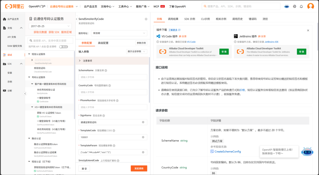 点击左下角的调用api测试短信认证服务。即可进入到api测试界面。